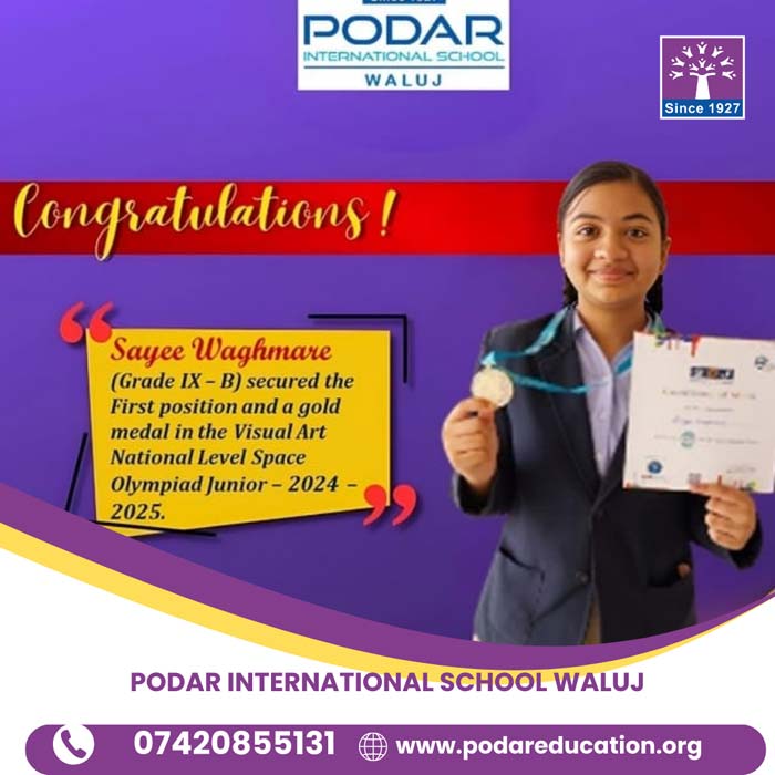 Congratulations to Sayee Waghmare (Grade IX-B) for securing First Position and winning a Gold Medal in the Visual Art National Level Space Olympiad Junior 2024–25!
